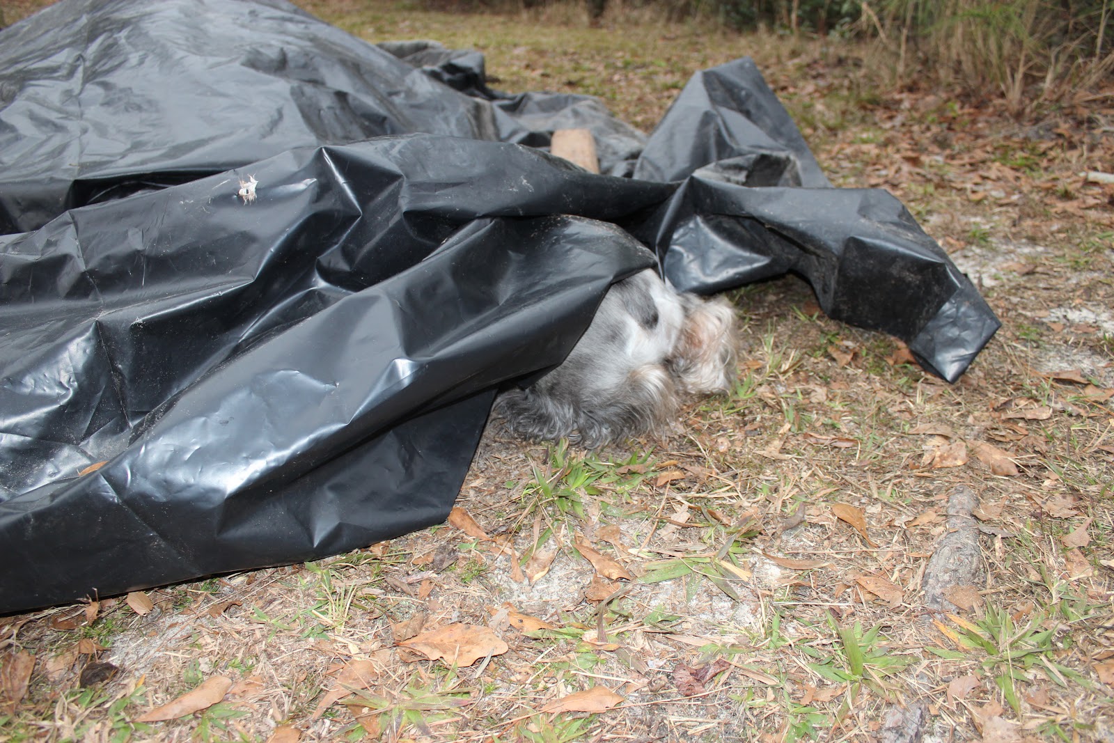 Stella can't wait. She darts under the tarp to make sure no mice are hiding.